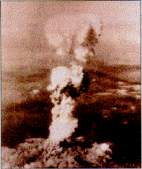| On August 6, 1945, a single atomic bomb was dropped on Hiroshima, Japan, devastating most of the city (below). Photo of the mushroom cloud (above) was taken several minutes after bomb was detonated. |